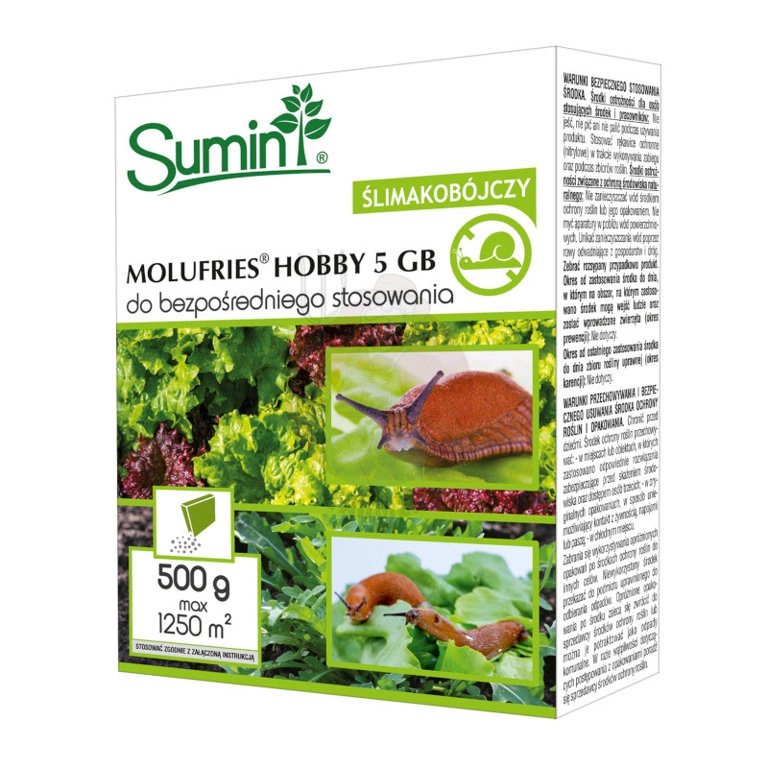 - Molufries Hobby 5 GB to Moluskocyd w formie przynęty granulowanej, przeznaczony do zwalczania ślimaków nagich.