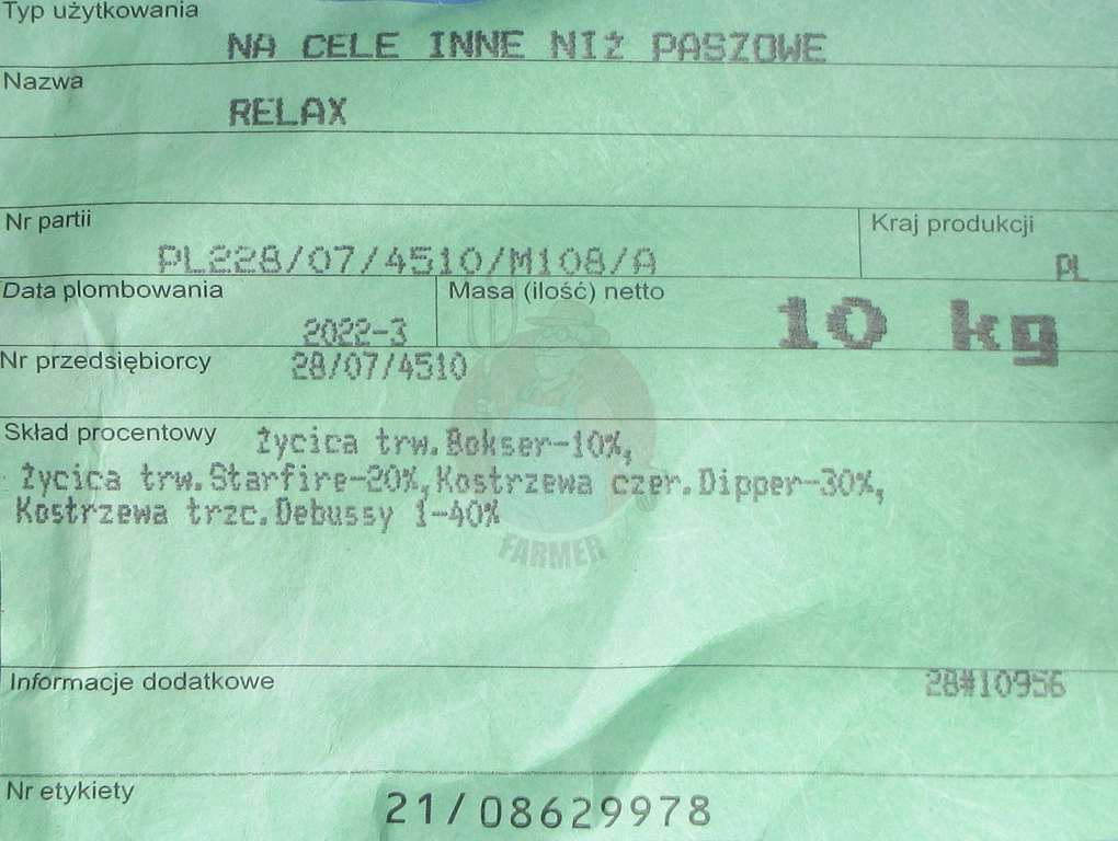 Nasiona wysiewać ręcznie (1kg/30m2) stosując siew krzyżowy na całej powierzchni - połowę nasion wysiać wzdłuż, a połowę w poprzek terenu lub przy pomocy siewnika (1kg/50m2). Po wysiewie nasion przykryć 1 cm warstwą ziemi. W okresie wschodów utrzymywać stałą wilgotność podłoża - zraszać lekkim strumieniem o drobnych kroplach wody (tak aby nie spowodować wypłukania nasion.