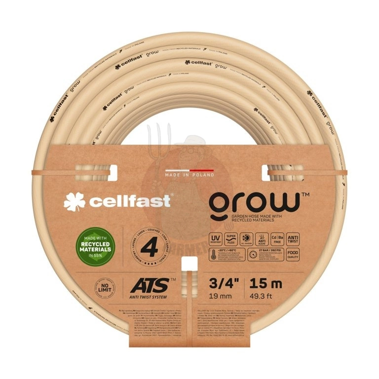 Wąż ogrodowy GROW, dzięki zastosowaniu wysokiej jakości materiałów, cechuje się maksymalną wytrzymałością na ciśnienie wody wynoszące 27 bar, odpornością na promieniowanie UV oraz temperatury robocze w zakresie od -20°C do +60°C, dlatego można użytkować go przez wszystkie sezony. Wyróżnia go także odporność na osadzanie się glonów w jego wnętrzu i promieniowanie UV.