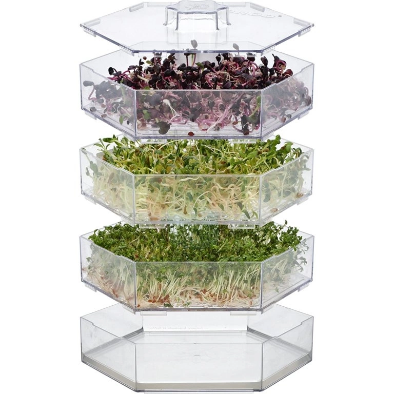 - Kiełkownica wielopoziomowa z pojemnikiem na wodę, sześciokątna, przezroczysta, 3 poziomy. Źródło niezbędnych witamin.