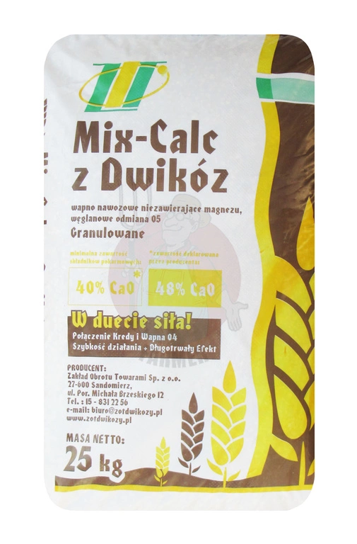 Mix-Calc z Dwikóz to produkt powstały z połączenia kredy nawozowej oraz wapna nawozowego typ. 04 w stosunku 1:1. Połączenie dwóch typów wapna nawozowego, szybkodziałającej kredy oraz wapna nawozowego odm. 04, które podtrzymuje pH, zapewnia dwuetapowe działanie i pomaga zabezpieczyć plony przed szkodliwym działaniem zakwaszenia gleby.