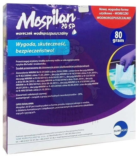 - Mospilan 20 SP jest insektycydem w formie proszku rozpuszczalnego w wodzie, o działaniu kontaktowym i żołądkowym, przeznaczonym do zwalczania szkodników ssących i gryzących. Na roślinie działa powierzchniowo, wgłębnie i systemicznie.