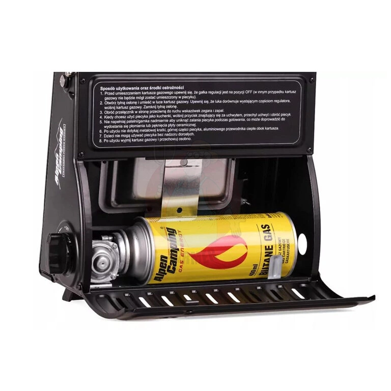 Oferowane urządzenie to praktyczny i kompaktowy sprzęt. Piecyk turystyczny jest niezastąpiony podczas całodziennego wypadu na ryby, w góry, na działkę czy do ogrzewania wentylowanych pomieszczeń. Oprócz tego zapłon piezoelektryczny sprawia, że można zapomnieć o stosowaniu zapałek. Może być zasilany za pomocą kartusza lub butli, a zużycie gazu wynosi 108g/h. Może być używany w temperaturach poniżej zera, ponieważ posiada wbudowaną metalową płytę, która utrzymuje kartusz w stałej temperaturze. Łatwa regulacja płomienia - tak jak na zwykłej kuchence gazowej.