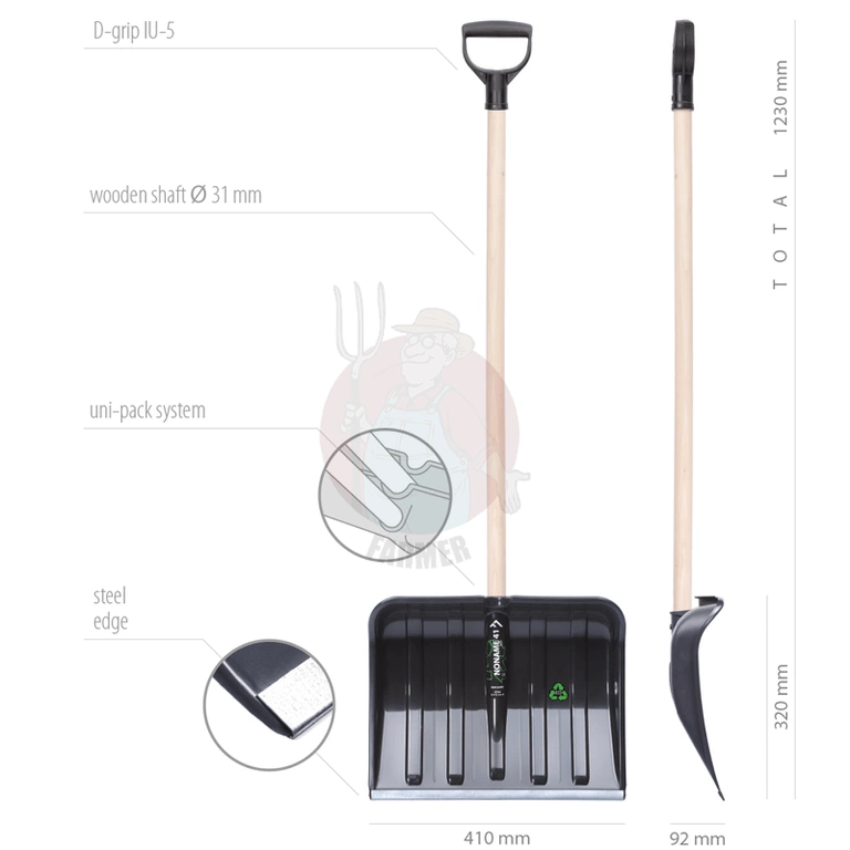 Łopata do śniegu została zaprojektowana tak, aby w jak najkrótszym czasie można oczyścić ze śniegu nawet dużą powierzchnię. Każda szufla posiada wzmocnione, metalowe okucie, które jest odporne na pracę przy oblodzonych lub kamienistych powierzchniach. Wytrzymałość i trwałość zastosowanych materiałów sprawia, że świetnie nadaje się także do usuwania śniegu na dużą skalę, także na wielkopowierzchniowych parkingach czy placach. Z powodzeniem można korzystać z łopaty przez kilka sezonów, co czyni ją ekonomicznym rozwiązaniem. Szeroka szufla pozwala na uniwersalne zastosowanie, także do przenoszenia materiałów sypkich, jak żwir lub piasek.