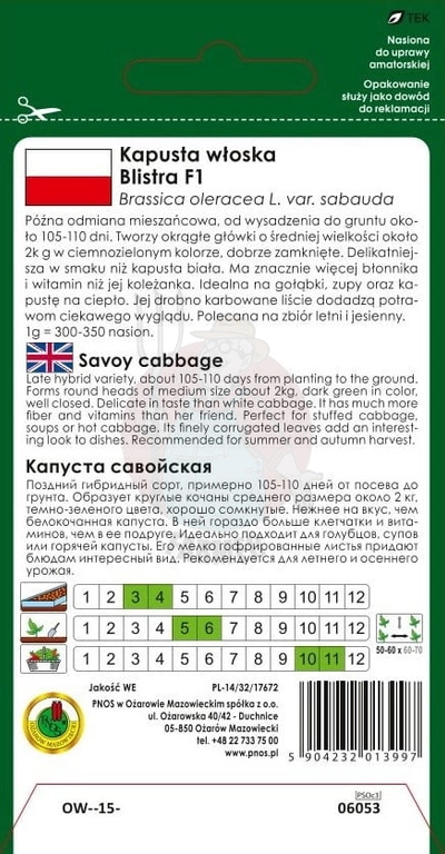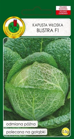 Późna odmiana mieszańcowa, od wysadzenia do gruntu do zbioru około 105-110 dni. Tworzy okrągłe główki o średniej wielkości około 2kg w ciemnozielonym kolorze, dobrze zamknięte. Delikatniejsza w smaku niż kapusta biała. Ma znacznie więcej błonnika i witamin niż jej koleżanka. Idealna na gołąbki, zupy oraz kapustę na ciepło. jej drobno karbowane liście dodadzą potrawom ciekawego wyglądu. Polecana na zbiór letni.