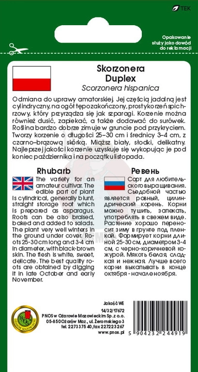 - Warzywo do uprawy amatorskiej odznaczające się dużą wartością odżywczą i dietetyczną. Korzenie spichrzowe cylindryczne, długości 25-30 cm i średnicy 3-4 cm, proste z czarno-brązową skórką. Miąższ biały, słodki, delikatny.