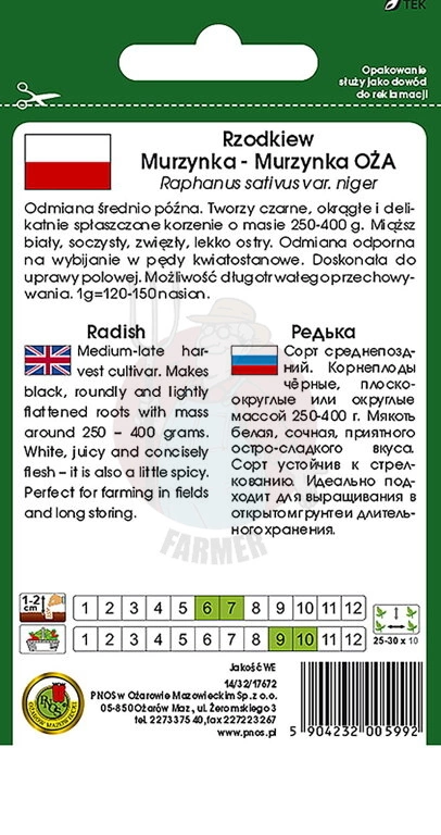 Odmiana średnio późna. Tworzy okrągłe i delikatnie spłaszczone korzenie o masie 250-400g. Miąższ biały, soczysty, zwięzły, lekko ostry, o wysokich wartościach odżywczych. Skórka czarna, matowa. Do uprawy na zbiór późnojesienny i zimowe przechowywanie. Odmiana odporna na wybijanie w pędy kwiatostanowe. Doskonała do uprawy polowej. Możliwość długotrwałego przechowywania.