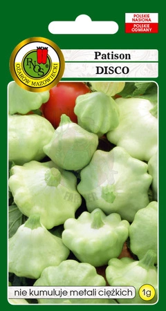 - Patison Disco to wczesna odmiana dyni zwyczajnej o krzaczastym, zwartym pokroju. Charakterystyczne owoce przybierają formę dzwonu z silnie ząbkowanym brzegiem. Kolor skórki w miarę dojrzewania owocu zmienia się z jasnozielonego na białokremowy.