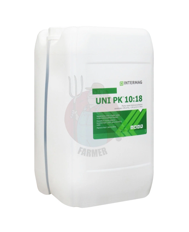 UNI PK 10:18 to płynny nawóz zawierający fosfor i potas (136 g P2O5 i 245 g K2O w 1 litrze) w formach łatwo dostępnych dla roślin. Stosowany nalistnie w zabiegach dokarmiania dolistnego szybko dostarcza roślinom fosfor i potas.