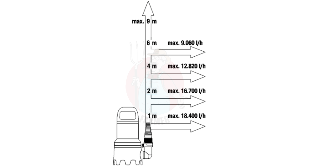 Maksymalna wysokość podnoszenia 9 m przy ciśnieniu 0,9 bara oznacza, że pompa jest wyjątkowo mocna i odpowiednia do wielu zastosowań, na przykład osuszania zalanych wykopów czy zanieczyszczonych oczek wodnych. Radzi sobie doskonale z zabrudzeniami wielkości do 35 mm.