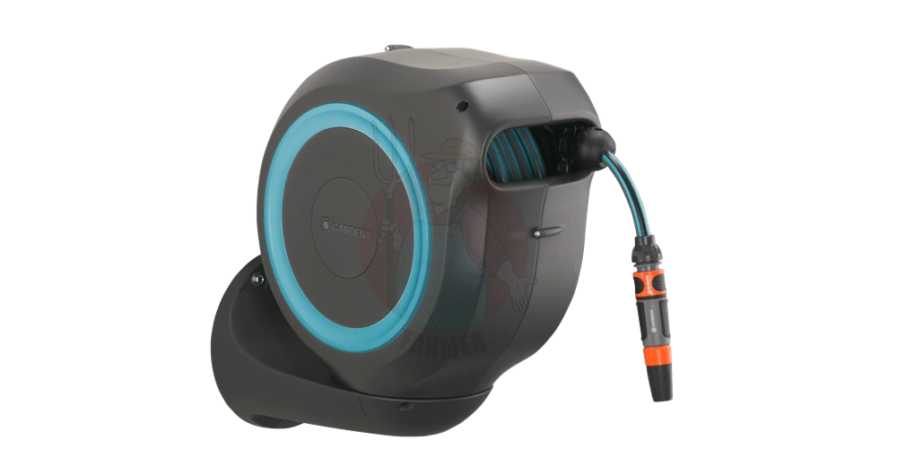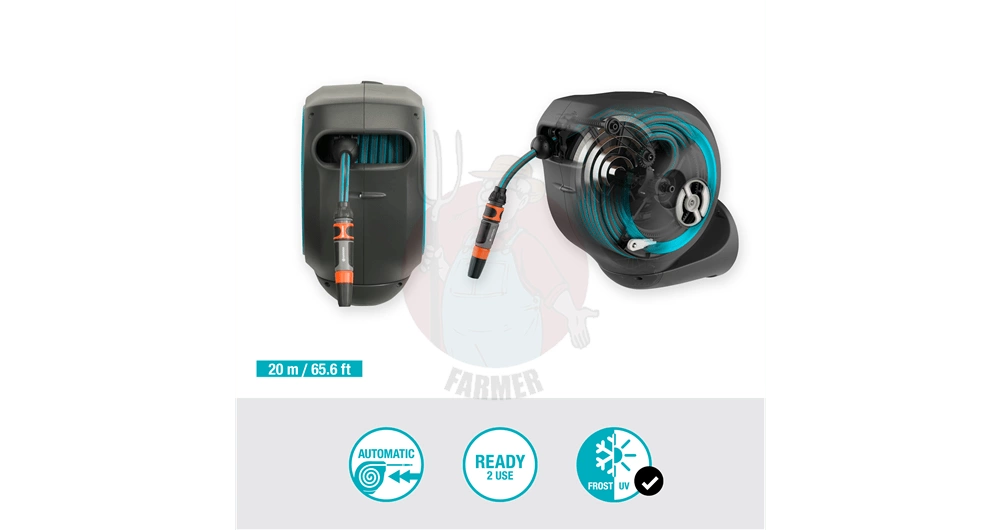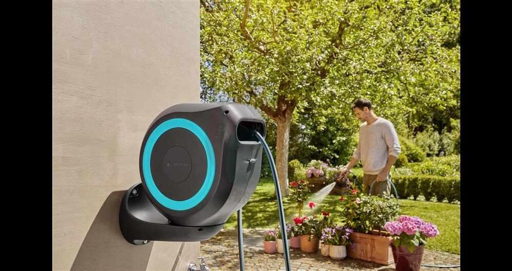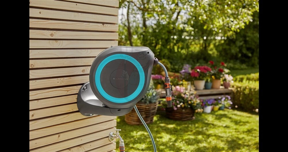Wbudowana prowadnica zapobiega skręcaniu i supłaniu węża w trakcie nawijania. Szybkozłącza i przyłącza kranowe z Original GARDENA System umożliwiają przedłużenie węża i dołączanie do niego innych akcesoriów do nawadniania GARDENA. Aby końcówki zraszające GARDENA były zawsze pod ręką, można je umieścić pod mocowaniem naściennym na ścianie, przechowując tam dla oszczędności miejsca.