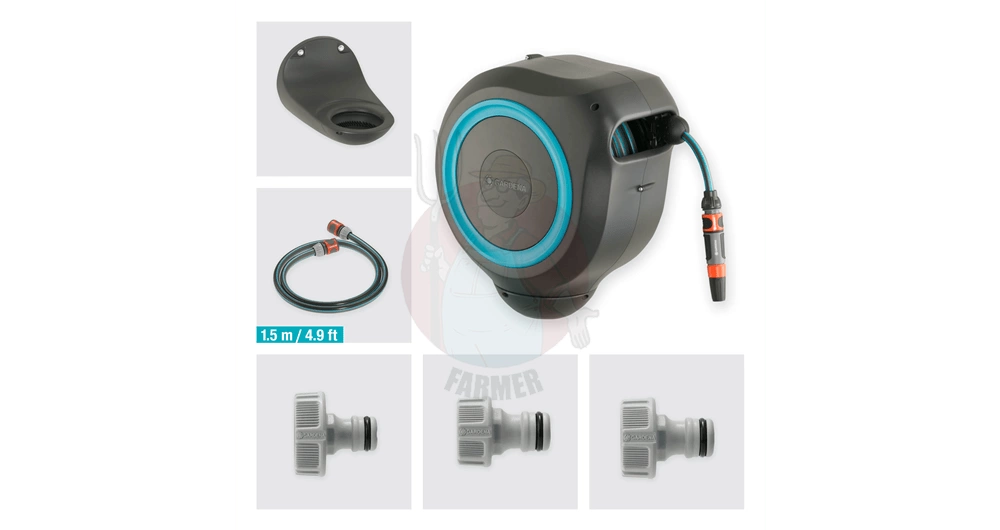 | Zestaw | 1x Bęben naścienny RollUp M, mocowanie naścienne, śruby, 1x 1.5m wąż przyłączeniowy, 3x przyłącze kranowe, 2x przyłącze węża, 1x złącze ze stopem, 1x zraszacz prosty |