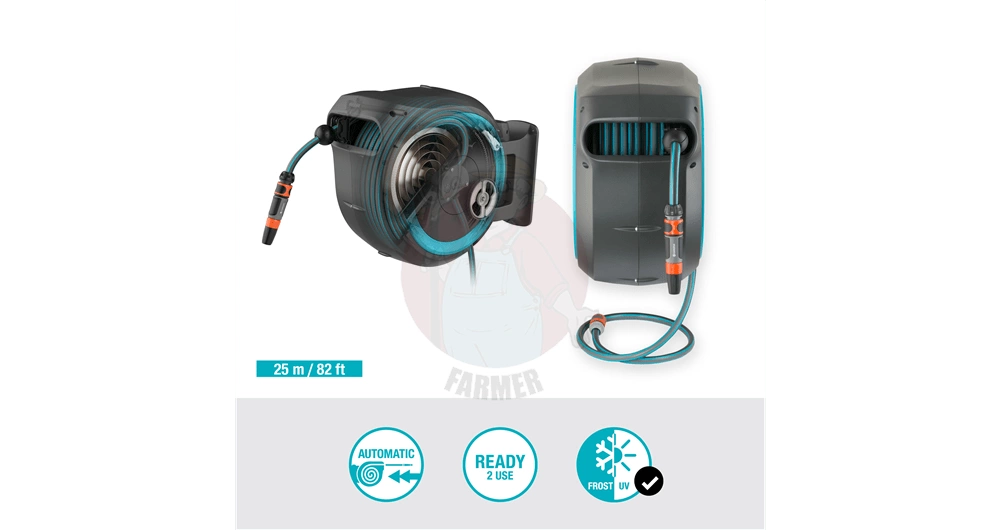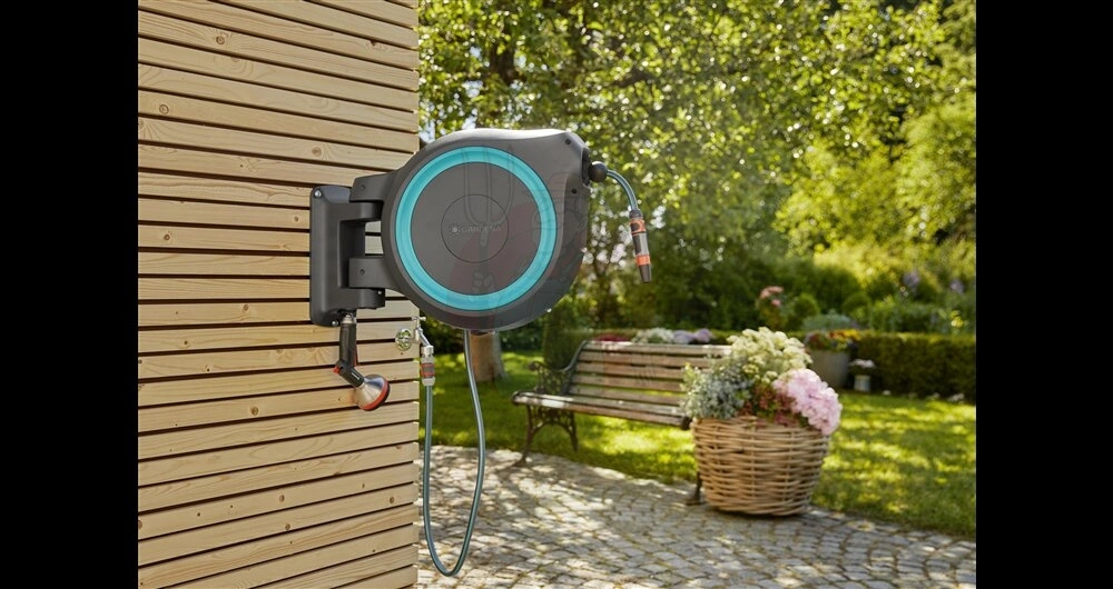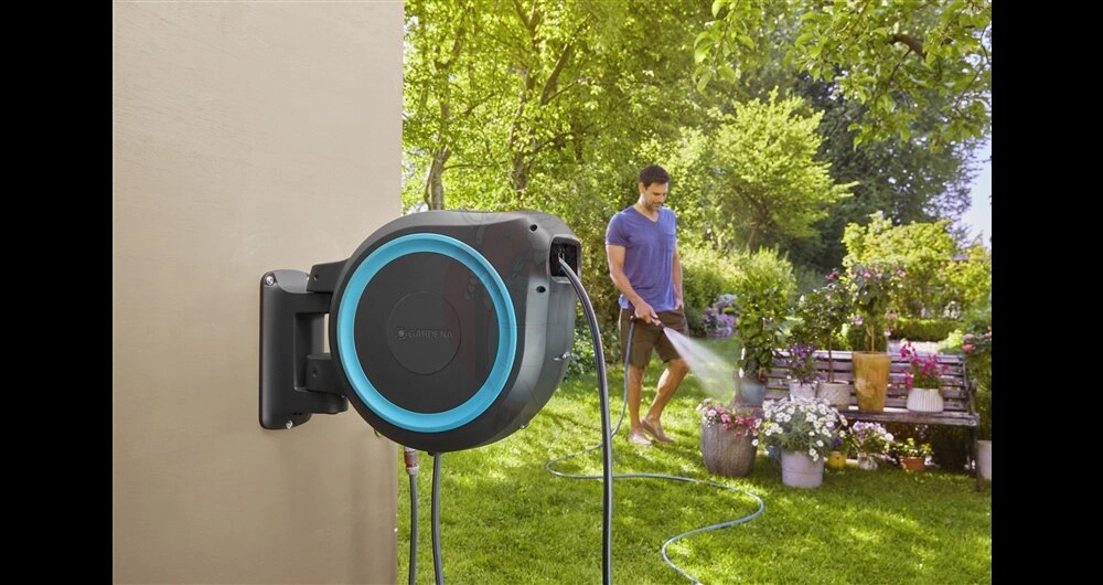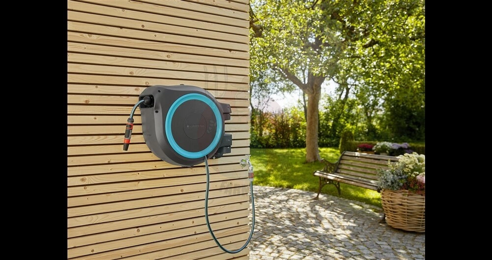 Przymocowany do dowolnej ściany bęben zapewnia bezpieczne i oszczędzające miejsce przechowywanie węża. Aby zacząć podlewać, wystarczy wyciągnąć odpowiednią ilość 25-metrowego węża. Jak tylko przestaniemy ciągnąć za wąż, blokada ustawiona na bardzo krótkie odstępy zatrzyma jego wciąganie, zablokowując go.