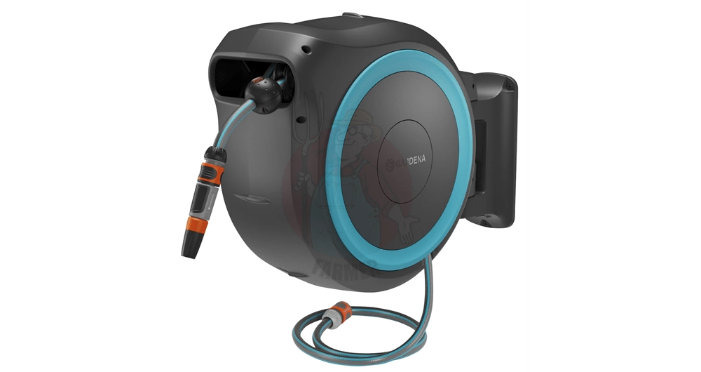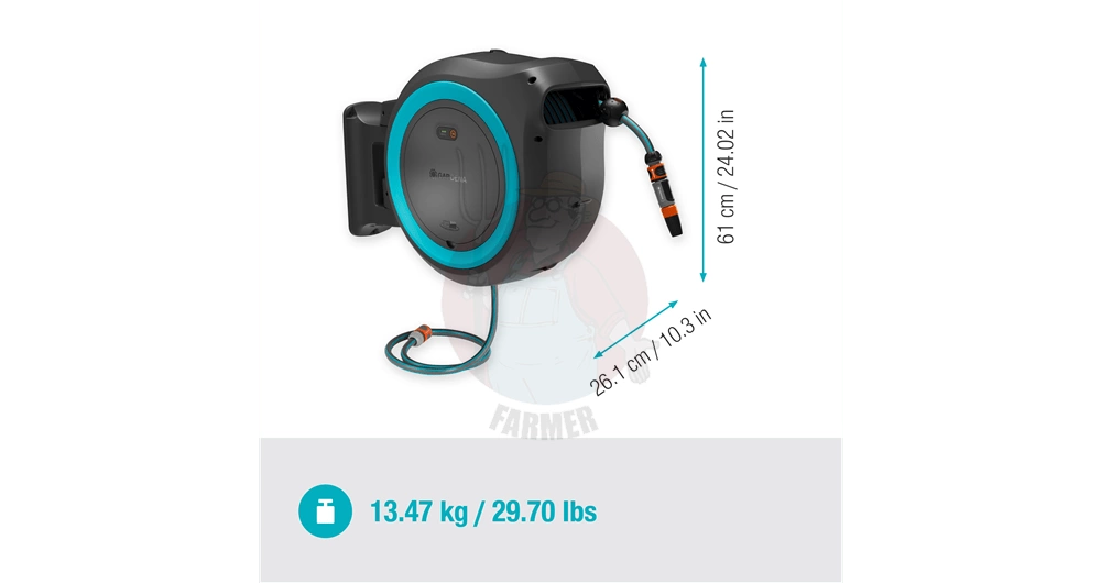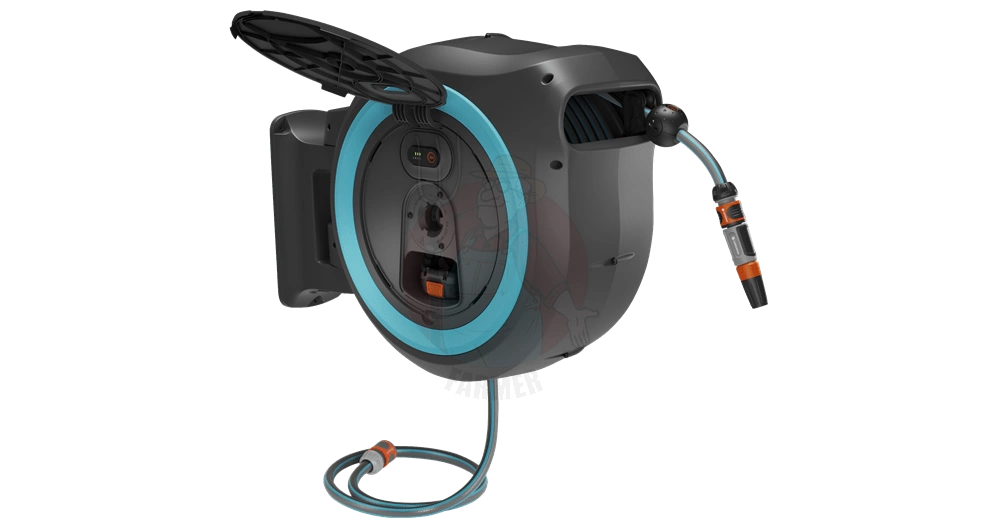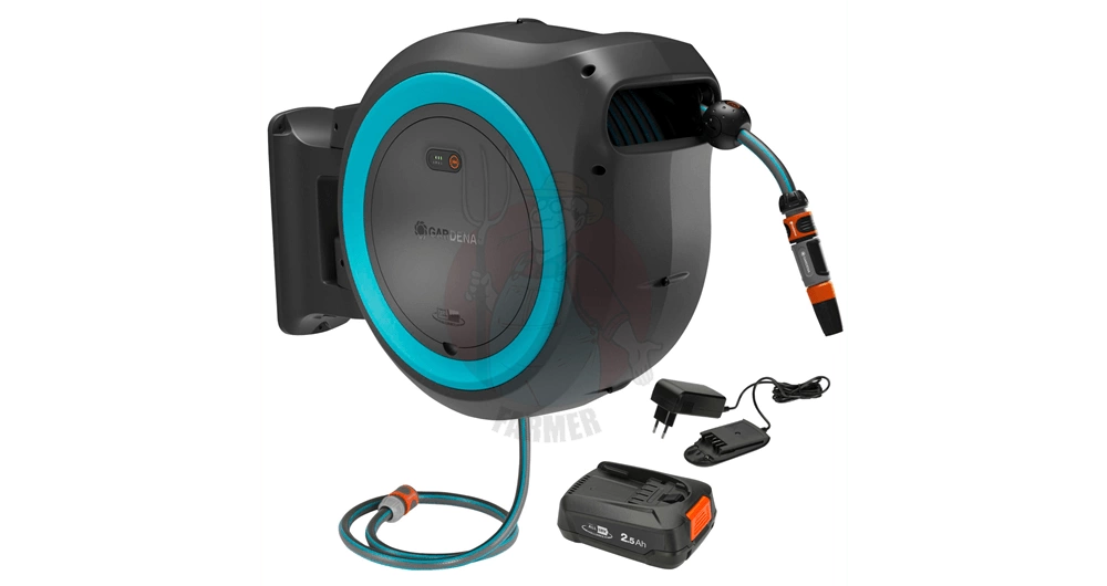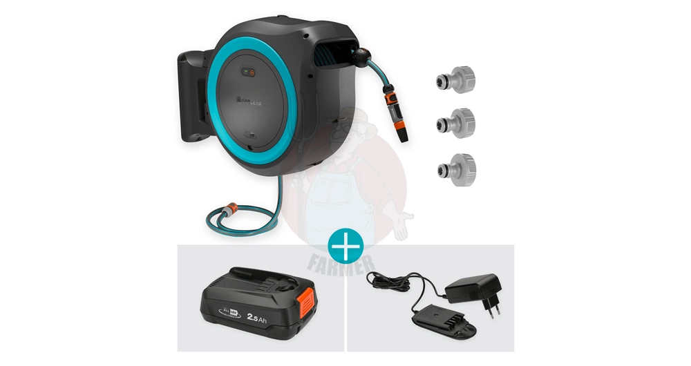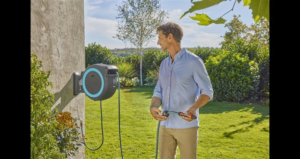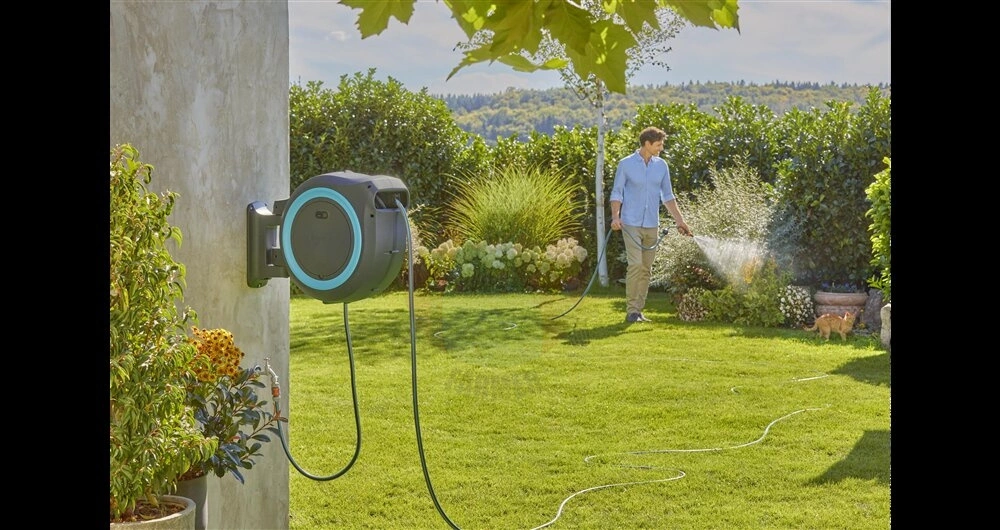 Wąż o długości 40 metrów wyposażony jest w pilota do zdalnego sterowania, za pomocą którego można uruchomić zasilany akumulatorowo bęben za naciśnięciem jednego przycisku. Dzięki zintegrowanej prowadnicy węża i funkcji RollControl+ wąż zwija się delikatnie i bez irytującego załamywania lub plątania się. Prędkość zwijania zmniejsza się na ostatnich 2 metrach, aby zapobiec uszkodzeniu węża. Naścienny zwijacz do węża zapewnia wygodne i kontrolowane nawadnianie.