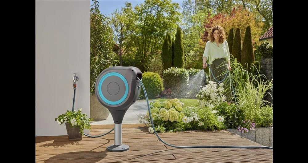 Zwijak do węża GARDENA RollUp M z funkcją automatycznego zwijania do montażu bezpośrednio na tarasie to idealne rozwiązanie do przechowywania węża do podlewania ogrodów średniej wielkości.