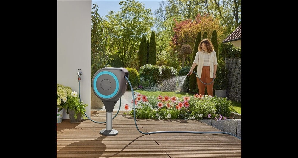 Zwijak do węża GARDENA RollUp S z funkcją automatycznego zwijania do zamontowania bezpośrednio na tarasie to idealne rozwiązanie do przechowywania węża w mniejszych ogrodach.