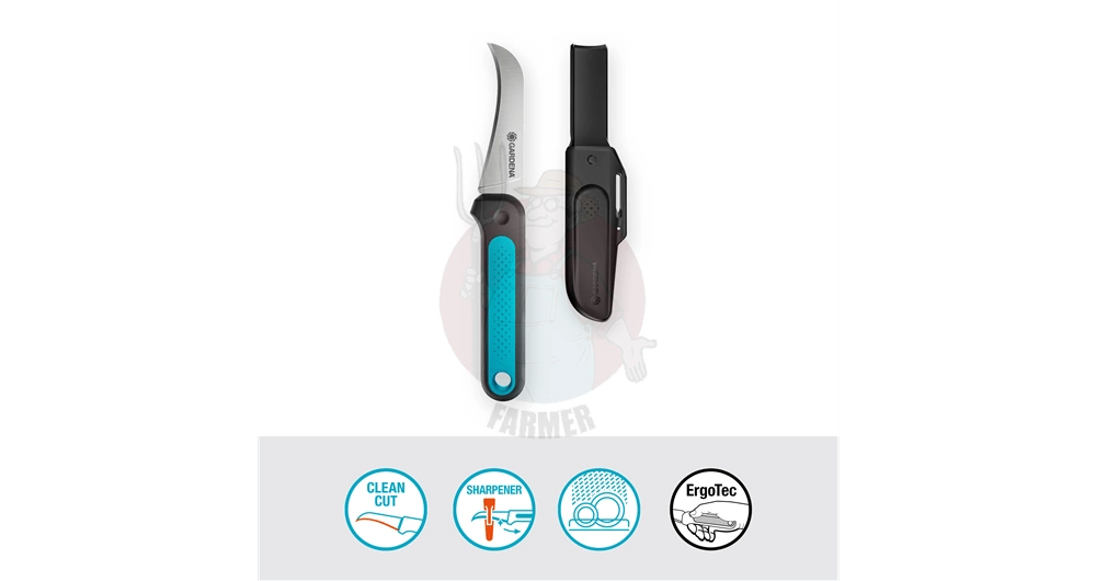 Opracowany w Niemczech nóż jest zawsze pod ręką w trakcie zbiorów dzięki futerałowi mocowanemu do paska, w którym może być bezpiecznie przechowywany. W razie potrzeby nóż można naostrzyć za pomocą zintegrowanej ostrzałki.