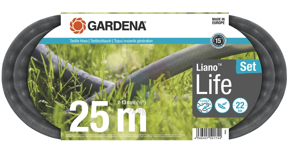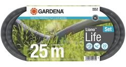 Wąż tekstylny Liano™ Life 25m – zestaw od GARDENA jest gotowy do natychmiastowego użytku w mniejszych ogrodach. Uniwersalny wąż tekstylny o średnicy 13 mm (1/2") idealnie nadaje się do krótkotrwałego lub średniej długości nawadniania.