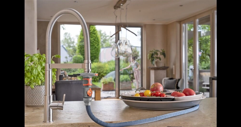 Wąż Liano™ Xtreme można podłączyć do kranu wewnętrznego w kilku prostych krokach, by bezpiecznie doprowadzać wodę z kuchni lub łazienki na zewnątrz. Wszystkie elementy dobrze do siebie pasują, a połączenie jest odporne na kapanie dzięki zaworowi regulacyjnemu i szybkozłączu ze stopem. Można zatem wygodnie podlewać rośliny na balkonie i tarasie. Po zakończeniu podlewania wystarczy zamknąć zawór i odłączyć go od kranu.