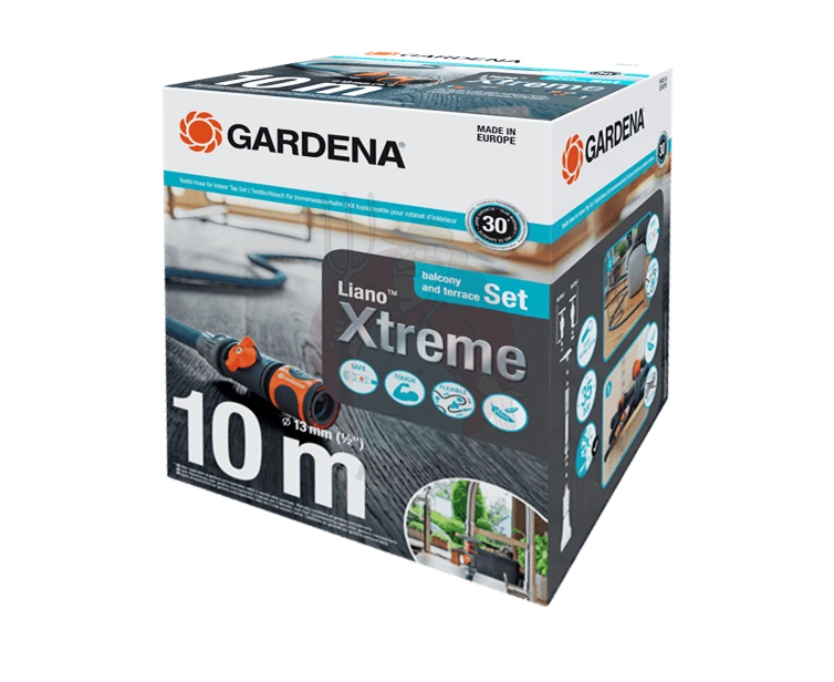 GARDENA wąż tekstylny Liano™ Xtreme 10 m z adapterem do kranów wewnętrznych – zestaw to kompletny zestaw Liano™ do wydajnego i bezpiecznego podlewania roślin na balkonach i tarasach. Zestaw zawiera 10-metrowy wąż o średnicy 13 mm (1/2"), pistolet zraszający, Liano™ adapter do kranów wewnętrznych z zaworem regulacyjnym, Liano™ szybkozłącze ze stopem oraz przyłącze do kranów wewnętrznych.