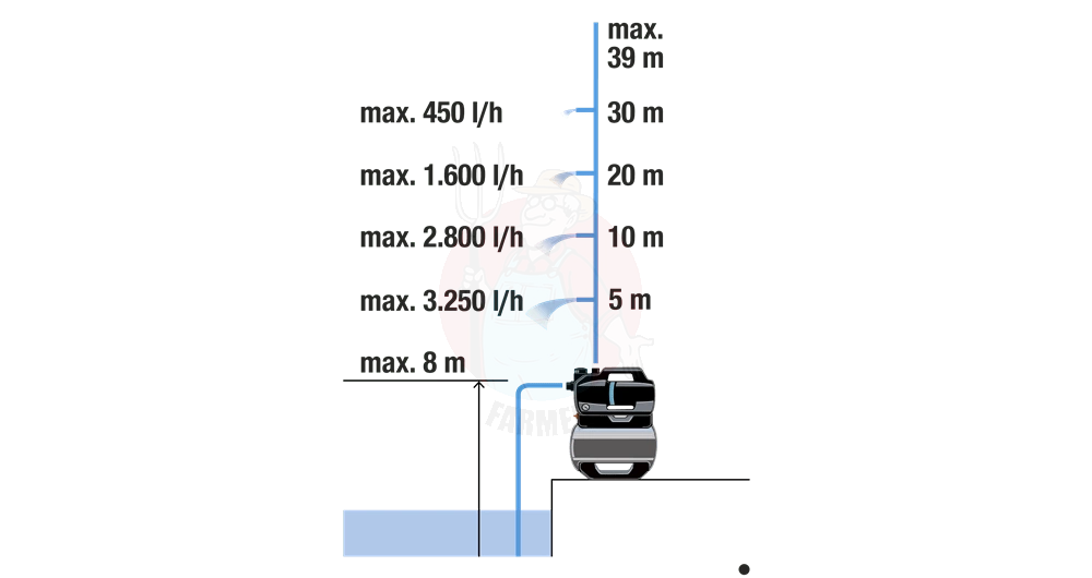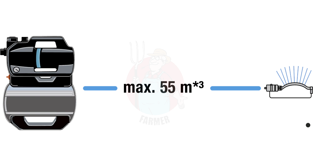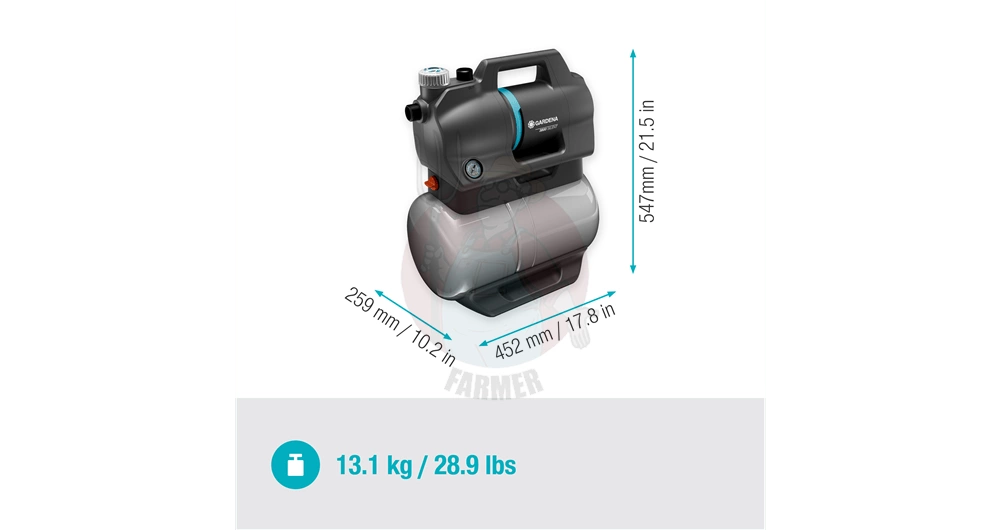Pompa ciśnieniowa oferuje dużą moc z wysokością podnoszenia 39 m (3,9 bara) oraz przepływem 3800 l/h, co sprawia, że jest to idealny podstawowy zestaw hydroforowy. Umiarkowane zużycie energii wynoszące zaledwie 600 W oznacza wysoką wydajność i energooszczędność, co jest korzystne dla portfela. Obudowa z tworzywa sztucznego obniża poziom ciśnienia akustycznego do maks. XX db(A) w odległości 5 m, dzięki czemu opracowana w Niemczech pompa pracuje stosunkowo cicho. Gumowe stopki zapewniają pompie stabilność i niski poziom drgań w trakcie pracy.