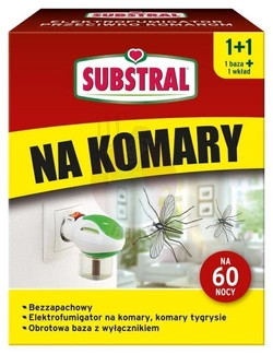 Produkt do zwalczania komarów, wytwarzający parę - tylko do użytku w pomieszczeniach zamkniętych. Elektrofumigator przeciwko komarom to produkt do zwalczania komarów (Culex quinquefasciatus, Aedes aegypti) i komarów tygrysich (Aedes albopictus). Wkład razem z urządzeniem elektrycznym jest skuteczny do 45 dni przy zastosowaniu 8-godzinnego trybu działania (8 godzin na dobę) w pomieszczeniach o powierzchni 30 metrów3. Produkt zaczyna działać po 2 godzinach od zastosowania. Aby uzyskać lepszą ochronę na większej powierzchni należy użyć więcej parującego produktu. Skuteczny przy otwartym oknie. Bezwonny. Łatwy w użyciu system ON/OFF - możemy wyłączyć urządzenie bez wyciągania go z gniazdka elektrycznego.