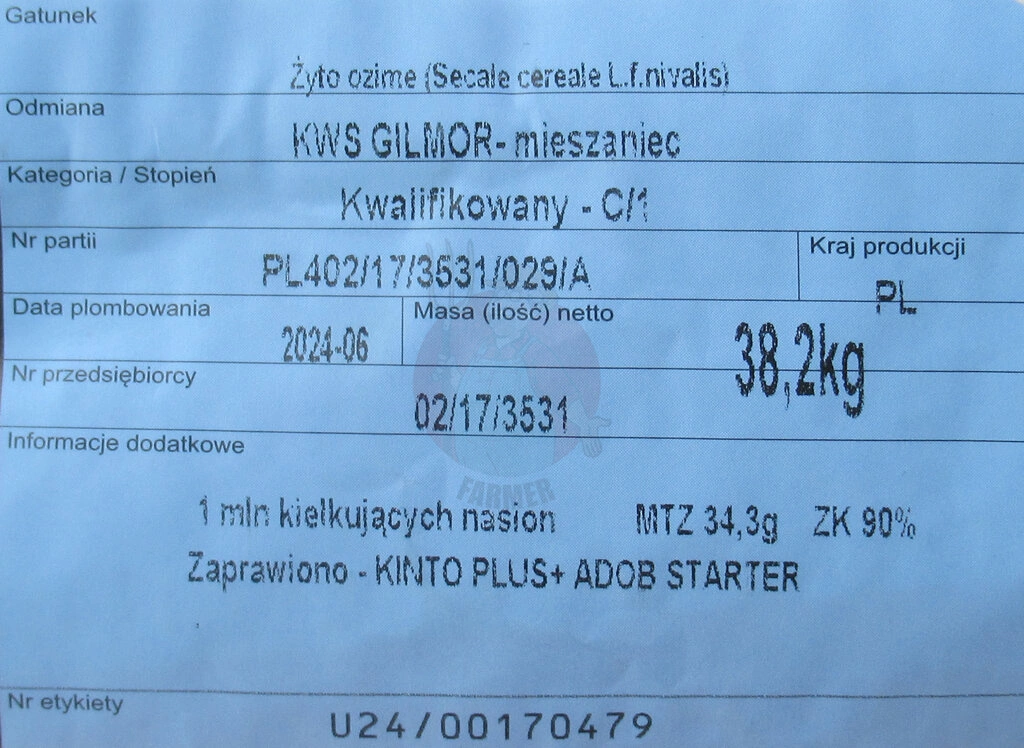 100% materiału siewnego żyta hybrydowego w opakowaniu - Nie ma potrzeby stosowania 10% dodatku odmiany populacyjnej.