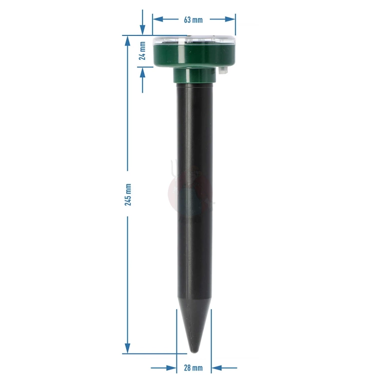 Odstraszacz ten to nowoczesne urządzenie służące do skutecznego, humanitarnego oraz bezkontaktowego odstraszania kretów i innych gryzoni. Emituje fale ultradźwiękowe i elektromagnetyczne o częstotliwości 400-1000 Hz, które są jedynie lekko słyszalne dla człowieka. Jest bezwonny, a także całkowicie bezpieczny dla ludzi oraz zwierząt, nie zakłóca działania innych urządzeń elektrycznych. Skutecznie pozbywa się niechcianych intruzów, tworząc niewidzialną barierę na obszarze ok. 650 m2 (w przestrzeni nie ograniczonej przeszkodami). Wysoce skuteczny - różna częstotliwość dźwięków generowanych