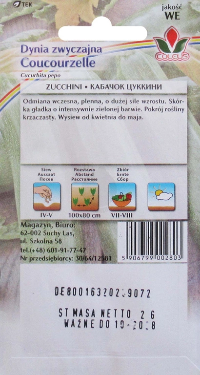 • Cukinia Coucourzelle to plenna odmiana o długich, zielonych owocach z jasnymi smugami. Ma chrupiący miąższ, idealna do duszenia, smażenia i grillowania. Wymaga ciepłego stanowiska i regularnego podlewania. Zbiory od czerwca do września.