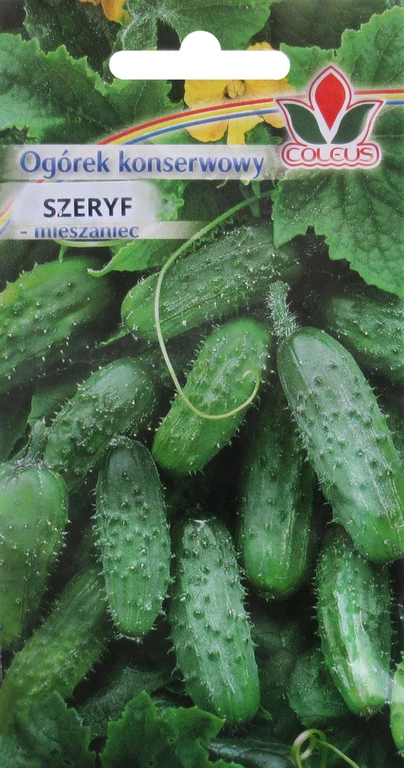 Ogórek 'SZERYF' F1 to średnio wczesna odmiana mieszańcowa, doskonale nadająca się do konserwowania. Rośliny tej odmiany charakteryzują się silnym wigorze i dominującymi kwiatami żeńskimi, co sprzyja wysokiemu plonowaniu. Owoce są cylindryczne, ciemnozielone, z delikatnym połyskiem, posiadają jasne smugi dochodzące do 1/3 długości owocu i rzadkie brodawki. Stosunek długości owocu do średnicy wynosi 3,2:1, co sprawia, że ogórki mają estetyczny wygląd i są idealne do przetworów.