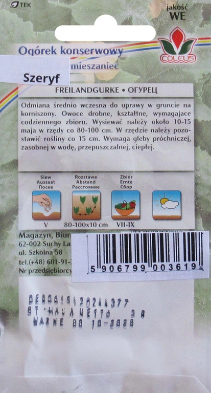 Zalecana norma wysiewu dla gruntowej uprawy wynosi 2-4 kg nasion na hektar, a dla rozsady 1-2 kg na hektar. Nasiona należy wysiewać w drugiej dekadzie kwietnia (rozsada) lub w pierwszej do drugiej dekadzie maja (grunt). Odmiana wymaga rozstawy 100-135 cm między rzędami i 10 cm w obrębie rzędów, a jej wegetacja trwa około 60-65 dni. Zbiór ogórków 'SZERYF' F1 przypada na okres od lipca do września, zapewniając świeże, wysokiej jakości owoce przez cały sezon.