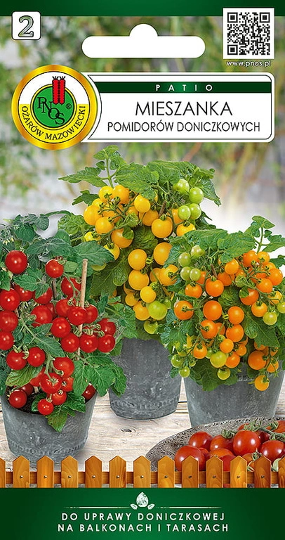 - Mieszanka pomidorów doniczkowych – kolorowe pomidorki w odcieniach żółtym, pomarańczowym i czerwonym, idealne do uprawy w pojemnikach na balkonach i tarasach. Rośliny o wysokości 30-50 cm, plenne, z owocami 15-20 g, smacznymi, słodkimi i jędrnymi.