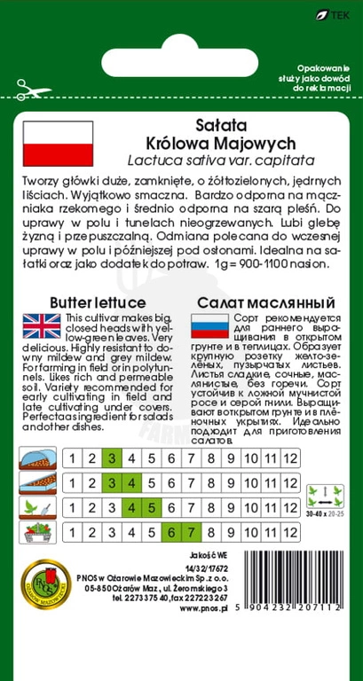 Sałata masłowa 'Królowa Majowych' to sprawdzona odmiana do wczesnej uprawy wiosennej, ceniona za smak, wysoką jakość główek oraz odporność na choroby. Dzięki możliwości uprawy zarówno w gruncie, jak i pod osłonami, świetnie sprawdza się w polskich warunkach klimatycznych. Jej soczyste, jędrne liście doskonale nadają się do spożycia na surowo, stanowiąc doskonały dodatek do zdrowej diety.