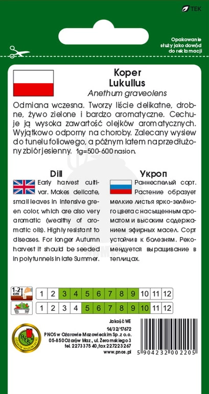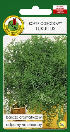 Koper ogrodowy Lukullus to wczesna i niezwykle aromatyczna odmiana o delikatnych, drobnych, intensywnie zielonych liściach. Charakteryzuje się wysoką zawartością olejków eterycznych, które nadają mu wyjątkowy smak i zapach, ceniony zarówno w domowej kuchni, jak i w przemyśle przetwórczym. W świeżej masie zawartość olejków wynosi 0,33 mg%, a w suchej masie – 0,10 mg%, co sprawia, że koper ten doskonale nadaje się do suszenia, mrożenia oraz bezpośredniego spożycia.