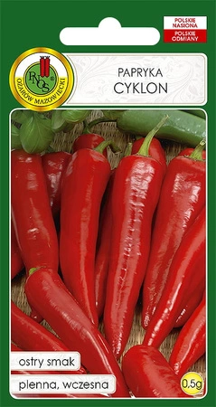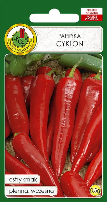 - Papryka Cyklon to wczesna odmiana ostrej papryki o stożkowatych owocach (7–10 cm), które dojrzewają do czerwieni. Wyróżnia się dużą plennością i dobrze znosi uprawę w gruncie. Idealna do suszenia, marynowania i przyprawiania potraw.
