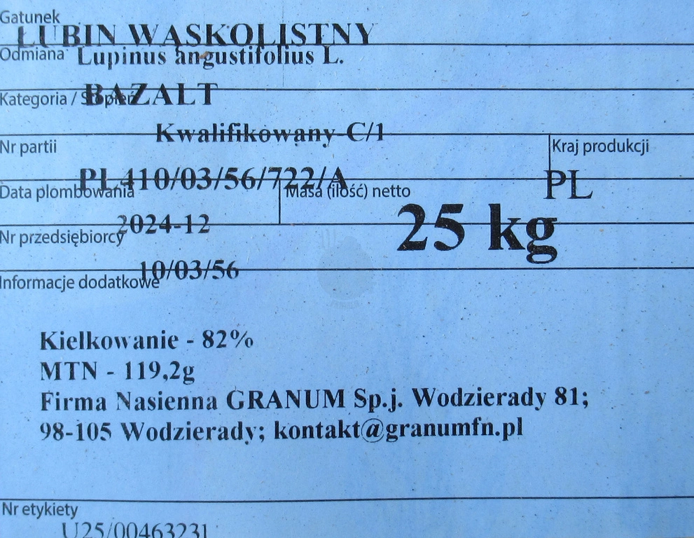 Łubin wąskolistny Bazalt kwalifikat C1 nasiona