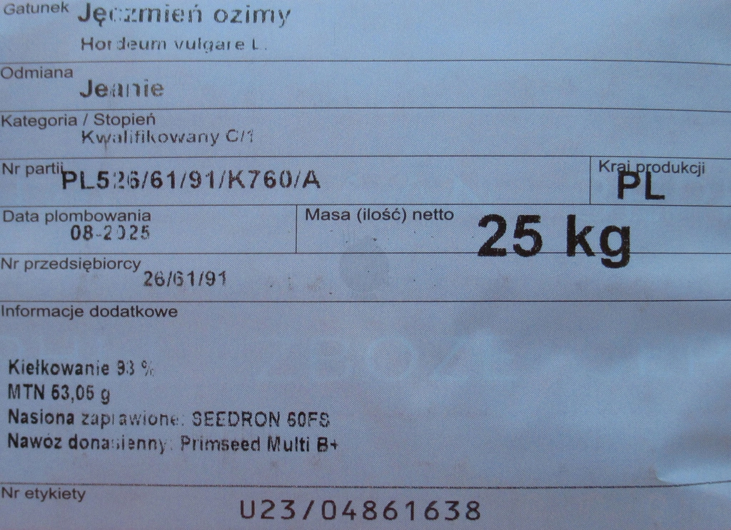 - Nowa 2-rzędowa odmiana paszowa o bardzo wysokiej mrozoodporności i stabilnym plonowaniu. Wyróżnia się grubym ziarnem, wysoką zdrowotnością oraz dobrą odpornością na wyleganie. Silnie się krzewi.
