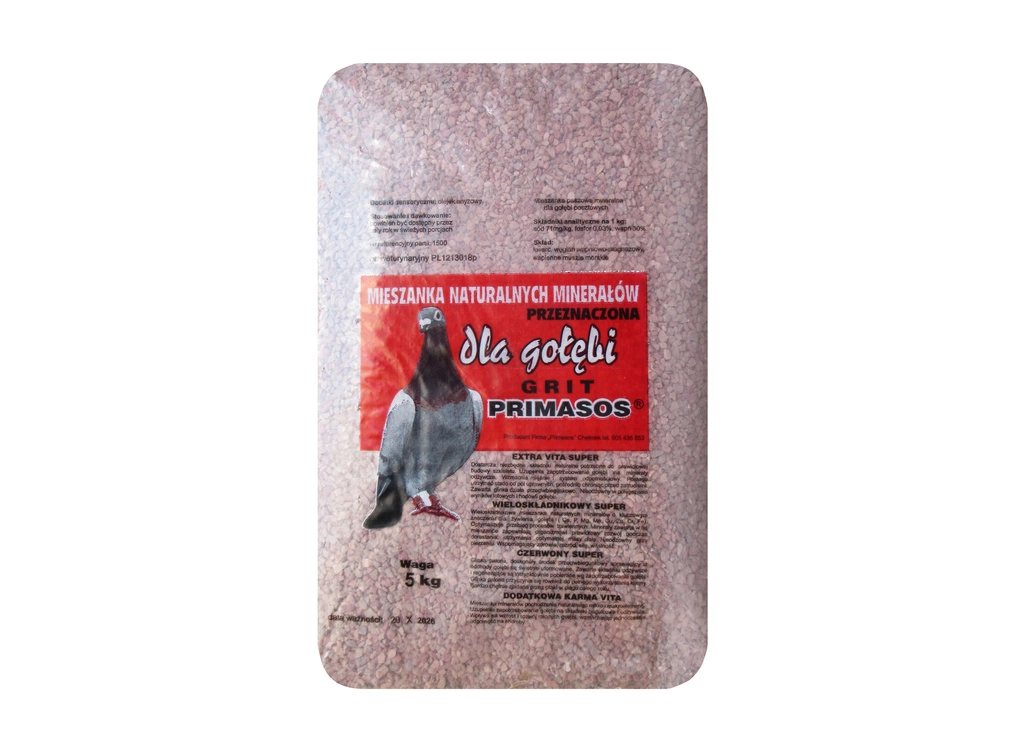 Pokarm Grit czerwony mieszany marki Primasos to wysokiej jakości mieszanka paszowa mineralna, stworzona z myślą o gołębiach pocztowych. Produkt pełni ważną rolę w codziennej diecie ptaków, dostarczając im niezbędnych składników mineralnych, które wspomagają prawidłowe funkcjonowanie układu pokarmowego i kostnego oraz ogólną kondycję hodowanych gołębi.