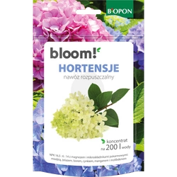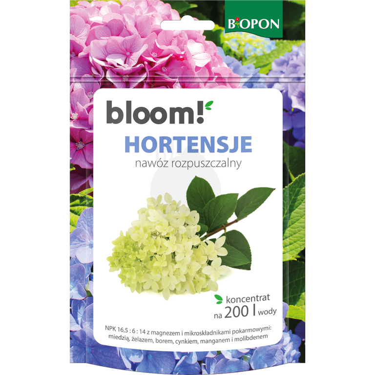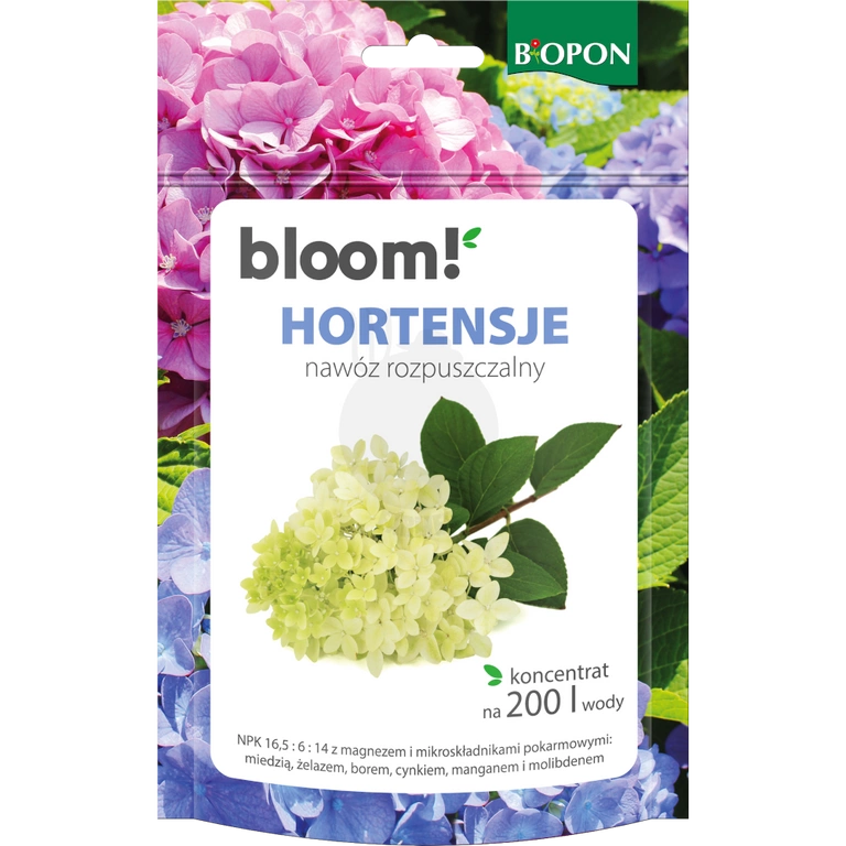 - BLOOM! Hortensje to łatwo rozpuszczalny nawóz krystaliczny do wszystkich odmian hortensji. Wzmacnia wzrost, wspiera intensywne kwitnienie i piękne wybarwienie kwiatów, a dzięki mikroelementom utrzymuje rośliny w doskonałej kondycji przez cały sezon.
