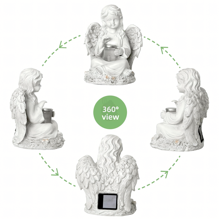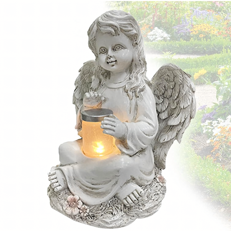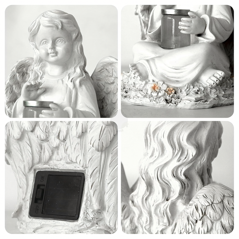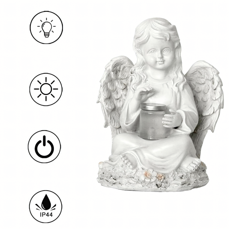 • Figurka aniołka solarnego LED z żywicy to elegancka i symboliczna dekoracja ogrodu, tarasu czy grobu. Ładowana energią słoneczną świeci do 8 godzin, wprowadzając nastrojowy klimat i pozostając odporna na deszcz, mróz i słońce.