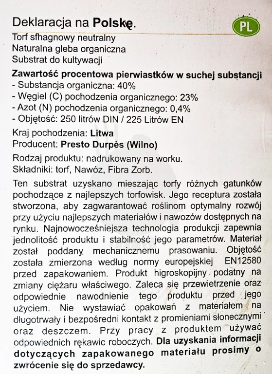 Deklarowana pojemność 250 litrów dotyczy produktu w momencie pakowania. W wyniku naturalnego procesu kompresji torfu podczas transportu może dojść do zmiany struktury i zmniejszenia objętości, co jest zjawiskiem naturalnym i nie wpływa na jakość produktu.