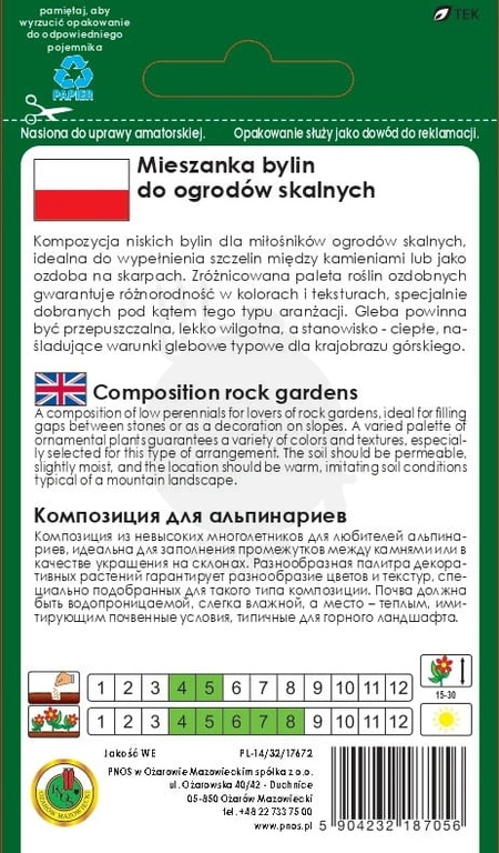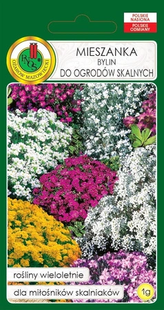 - Mieszanka niskich bylin do ogrodów skalnych. Rośliny wieloletnie o zwartej formie, przeznaczone na stanowiska słoneczne. Kwitną od maja do sierpnia w drugim roku uprawy.