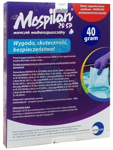 - Mospilan 20 SP jest insektycydem w formie proszku rozpuszczalnego w wodzie, o działaniu kontaktowym i żołądkowym, przeznaczonym do zwalczania szkodników ssących i gryzących. Na roślinie działa powierzchniowo, wgłębnie i systemicznie.