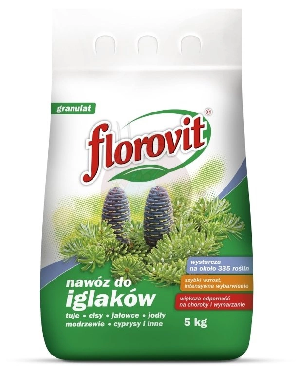 Florovit do roślin iglastych zawiera składniki mineralne w ilościach odpowiadających zapotrzebowaniu ozdobnych roślin iglastych takich jak cis, modrzew, cyprys, świerk, sosna, jodła i inne.