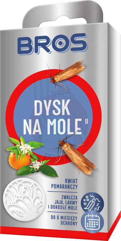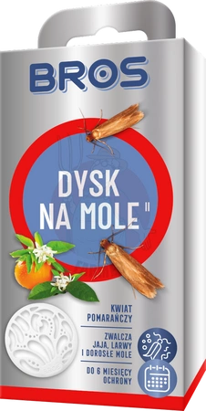 - Dysk skutecznie zwalcza mole odzieżowe (osobniki dorosłe, jaja i larwy) w szafach, szufladach i garderobach. Nadaje delikatny zapach i chroni ubrania do 6 miesięcy.