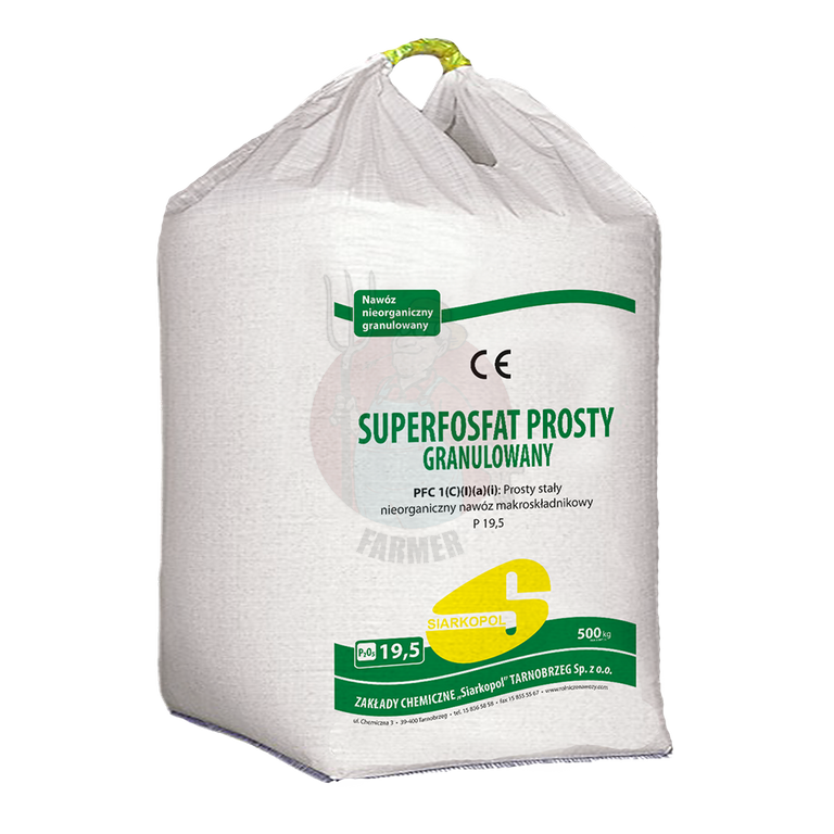 SUPERFOSFAT PROSTY GRANULOWANY zawiera 19% fosforu (P2O5) w formie fosforanu jednowapniowego, 32% siarki przyswajalnej (S) potrzebnej roślinom do tworzenia białek oraz 20% wapnia (CaO). Nawóz zawiera również występujące w naturalnych fosforytach mikroelementy. Granulowana forma nawozu ogranicza powstawanie w glebie trudno dostępnych dla roślin fosforanów glinowych i żelazowych. Umożliwia to stosowanie nawozu na glebach o różnym odczynie.