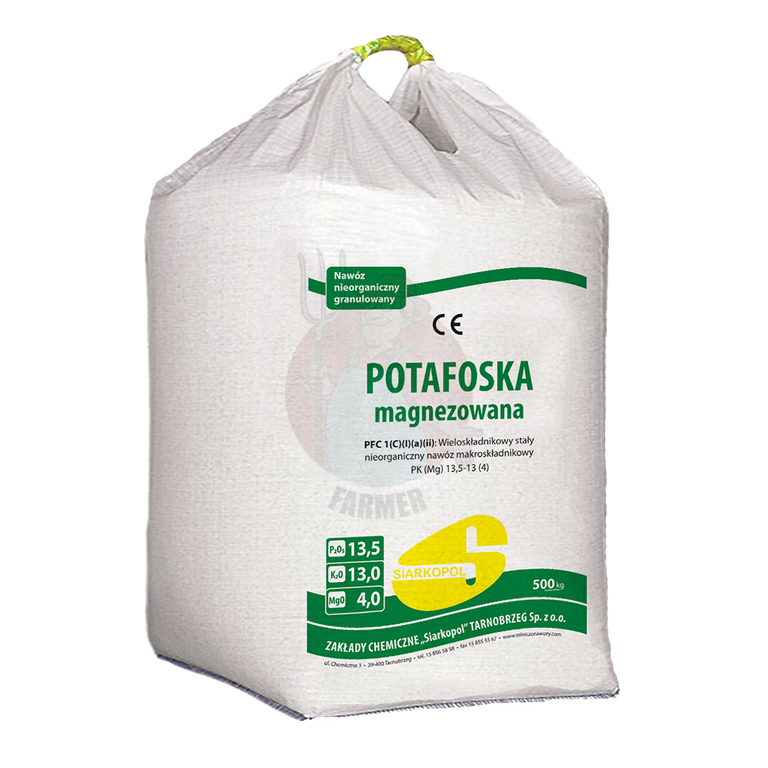 - Granulat - zawiera 13% fosforu w formie fosforanu jednowapniowego, 13% potasu w formie soli potasowej, 13% wapnia, 4% magnezu w formie węglanowej, 22% siarki przyswajalnej niezbędnej roślinom do budowy białek.