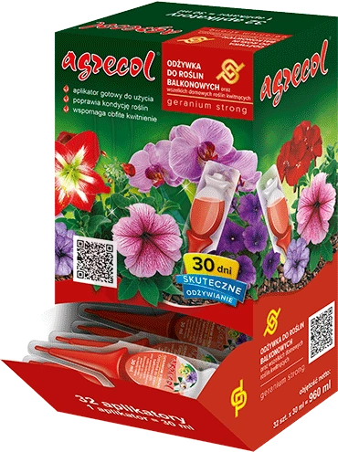 - Geranium Strong – odżywka do roślin balkonowych oraz wszelkich domowych roślin kwitnących. Specjalistyczny i wyjątkowo innowacyjny preparat przeznaczony do regeneracji wszystkich gatunków i odmian roślin kwitnących.