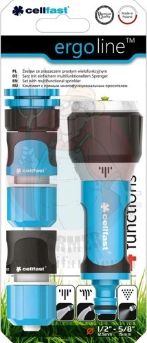- wysokiej klasy, kompletny zestaw ERGO ze zraszaczem prostym wielofunkcyjnym i akcesoriami: - szybkozłączem - stop, - szybkozłączem - przelot, - uniwersalnym przyłączem z gwintem wewnętrznym