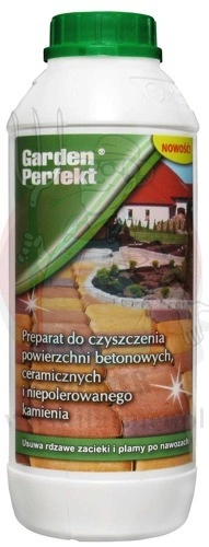 - Preparat Garden Perfekt w ilości ok. 100 g/m2 rozprowadzić na zabrudzonej powierzchni za pomocą szczotki lub spryskiwacza, bez specjalnego szorowania.